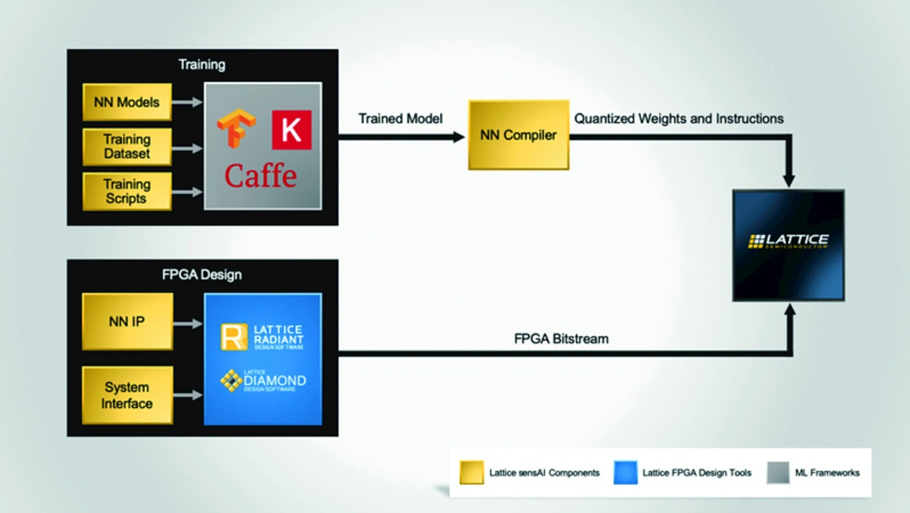 Zum Beispiel bietet Lattice Semiconductor eine umfangreiche Auswahl an Services und Tools, zum Beispiel »sensAI«, an. Hiermit will das Unternehmen Anwendern seiner iCE40- oder ECP5-FPGAs sowie den auf der Nexus-Plattform basierenden Familien CrossLink-NX und Certus-NX die Möglichkeit geben, trainierte Modelle auf die Plattformen zu portieren (Bild 2). Jedoch umfasst der sensAI Stack ebenso modulare Hardware-Plattformen, exemplarische Demonstrationen, Referenzdesigns, Neurale-Netzwerk-IP-Cores sowie Software Tools für das Entwickeln sowie kundenspezifische Design Services.