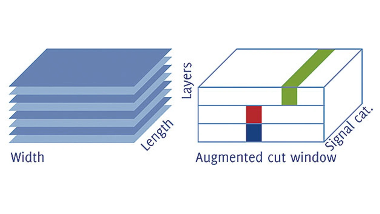 Die Forschergruppe IntelligEnt hat deshalb einen neuen Ansatz untersucht: Durch Querschnitte durch das Layout kann die Geometrie durch ein 2D-Datenschema repräsentiert werden, Signaleigenschaften kommen in der dritten Dimension hinzu (Bild 2). Diese Methode ist vergleichbar mit einem Farbbild: Die Helligkeit des Bilds zeigt die Geometrie, wogegen die Farbkanäle für die Signaleigenschaften wie z.B. Kategorien genutzt werden.