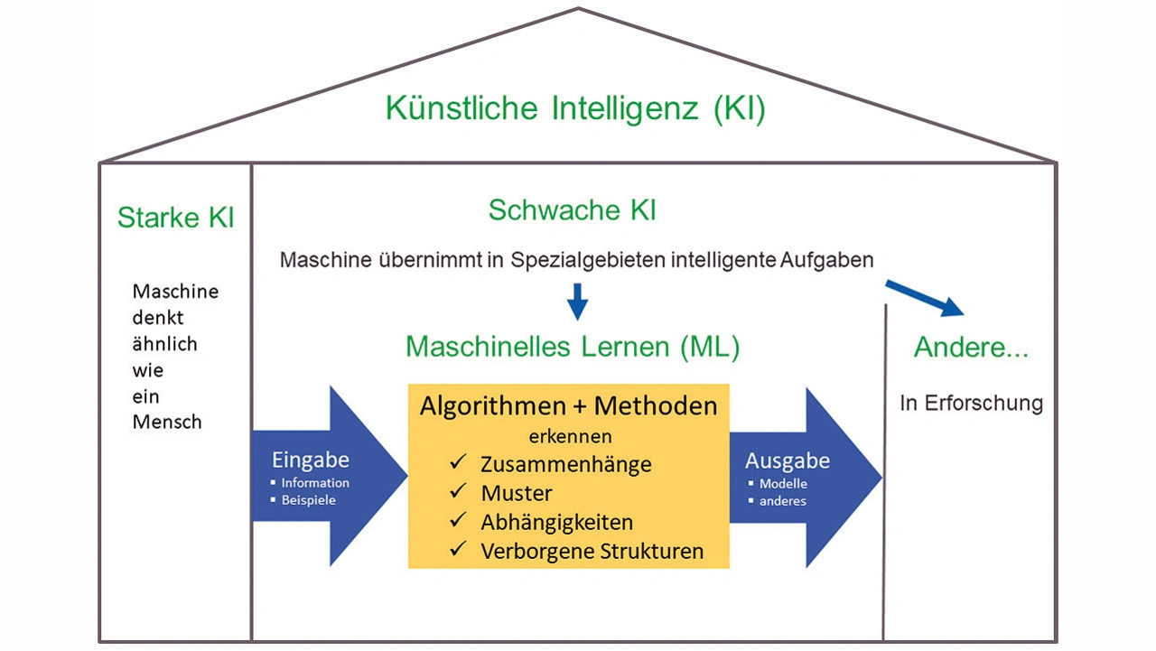 Alle KI-Systeme, die heute real eingesetzt und konkret entwickelt werden, entsprechen einer schwachen KI. Das bedeutet, dass eine Maschine eine genau festgelegte Aufgabe schneller, besser und effizienter erledigt. Praktisch umgesetzt wird dies mit maschinellem Lernen. Die meisten aktuell im Einsatz befindlichen KI-Systeme beruhen auf maschinellem Lernen. Andere Technologien zur schwachen KI befinden sich noch im Stadium der Forschung.
