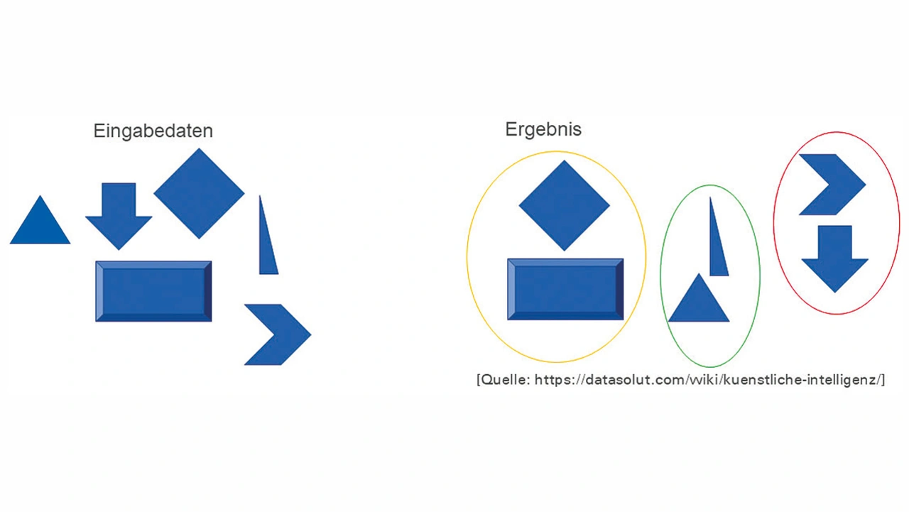 Körper mit drei Ecken, mit vier Ecken und sonstige werden in Cluster eingeteilt. Die unbekannten Daten werden dann nach diesen Kriterien gruppiert. Konkrete aktuelle Anwendungsfälle im IT-Software-Bereich sind: