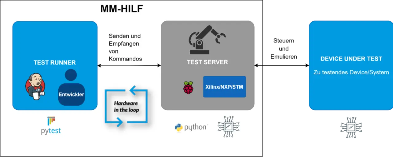 Auf dem MM-HILF laufen als die zwei zentralen Komponenten ein Test Server und ein Test Runner, beide Python-basiert (Bild 1). Der Test Server, beispielsweise von Xilinx, NXP Semiconductors oder STMicroelectronics, emuliert die Umgebung für das DuT und steuert es, während auf dem Test Runner die Testausführung selbst abläuft. Hierbei ist das DuT selbst über die jeweilig relevanten Schnittstellen an das MM-HILF angeschlossen.