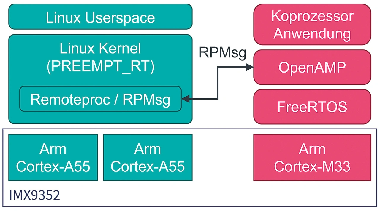 Eine komplette Kapselung der Ausführungsumgebungen ist in der Praxis jedoch nicht nützlich. Schließlich soll das Linux-System dazu in der Lage sein, Informationen mit der Echtzeitumgebung auszutauschen. Der Linux-Kernel enthält mit Remote Processor Messaging (RPMsg) bereits ein Framework für die Interprozessorkommunikation, also die Kommunikation mit einem Coprozessor. Für die Implementierung der Interprozessor-kommunikation in der Coprozessor-Firmware gibt es die OpenAMP-Bibliothek. Sie enthält standardisierte Implementierungen, die auf RPMsg basieren und so die Datenübertragung zwischen dem Coprozessor und dem Linux-System ermöglicht.