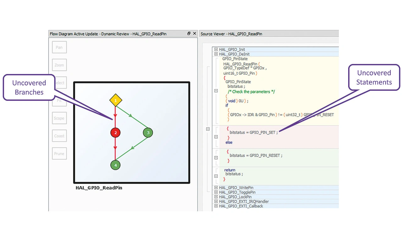 Fehler im Daten- oder Kontrollfluss können Schwachstellen im Code zur Folge haben. Mit der Kontroll- und Datenflussanalyse lässt sich bestätigen, dass beide im Einklang mit der Systementwicklung stehen. Tools, die statische und dynamische Analysefunktionen für Host- und Embedded-Software bieten, arbeiten den Kontrollfluss heraus und illustrieren ihn in Form von Flussdiagrammen, die den Verarbeitungswegen überlagert werden können (Bild 10).