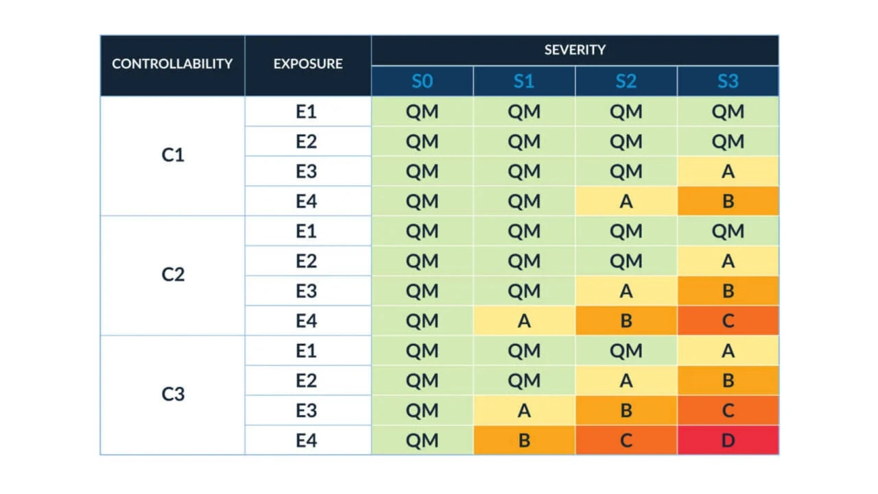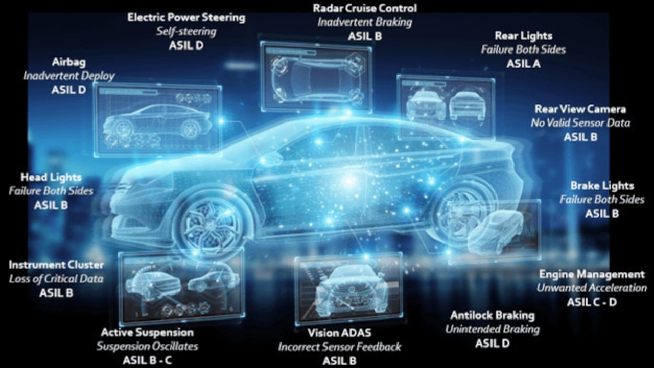 ASIL (Automotive Safety Integrity Level) klassifiziert das Risiko hinsichtlich der funktionalen Sicherheit von Straßenfahrzeugen. Die verschiedenen Autoteile erhalten dabei unterschiedliche ASIL-Bewertungen: Rang A entspricht einer niedrigeren Sicherheitsstufe, bei Rang D hingegen muss die Software und/oder Hardware die strengsten Auflagen erfüllen. Teile wie die Rücklichter oder sogar das Armaturenbrett kommen nicht über ASIL B hinaus, die elektrische Servolenkung und ABS-Bremsen jedoch sind wegen ihres Einflusses auf den Betrieb des Fahrzeugs mit Rang D eingestuft.