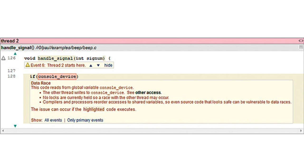 Das Data Race betrifft die geteilte Variable »console_device«. Als erster Thread wird das Hauptprogramm erkannt (Bild a), der zweite Thread ist der Signal-Handler (Bild b). Beide greifen auf die Variable console_device zu, ohne dass ein Locking oder ein anderer Mechanismus zur Synchronisation vorhanden ist (Bild c). Mithilfe der statischen Code-Analyse hätte ein Entwickler den Fehler frühzeitig erkennen können.