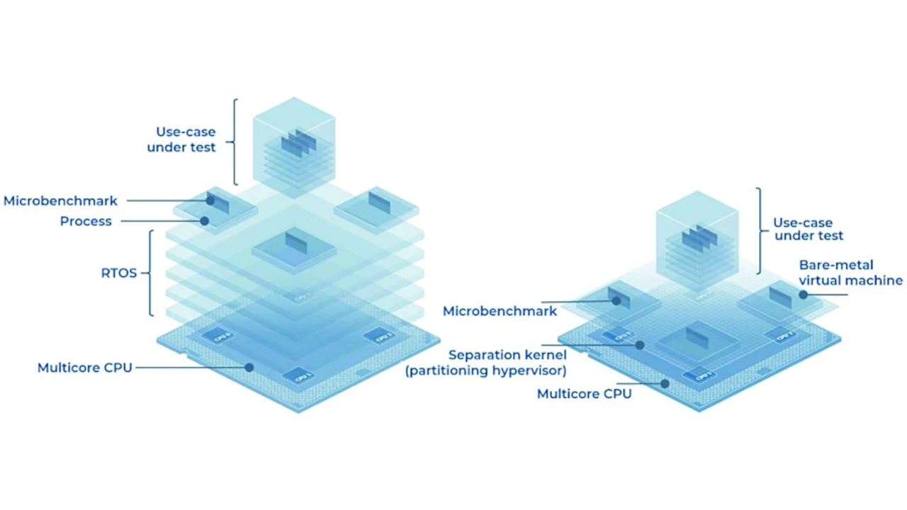 Da das Problem der robusten Speicherpartitionierung durch den Hypervisor gelöst ist, bleibt das Problem der Zeitpartitionierung offen und kann untersucht werden. Die Speicheraufteilung ohne ein RTOS verbessert die Genauigkeit der Messung von Timing-Störungen (Bild 1). Es ist wie das Polieren der Linse eines Mikroskops. Multicore-Timing-Effekte können flüchtig und unvorhersehbar sein. Die Eliminierung des RTOS hilft in zweierlei Hinsicht.