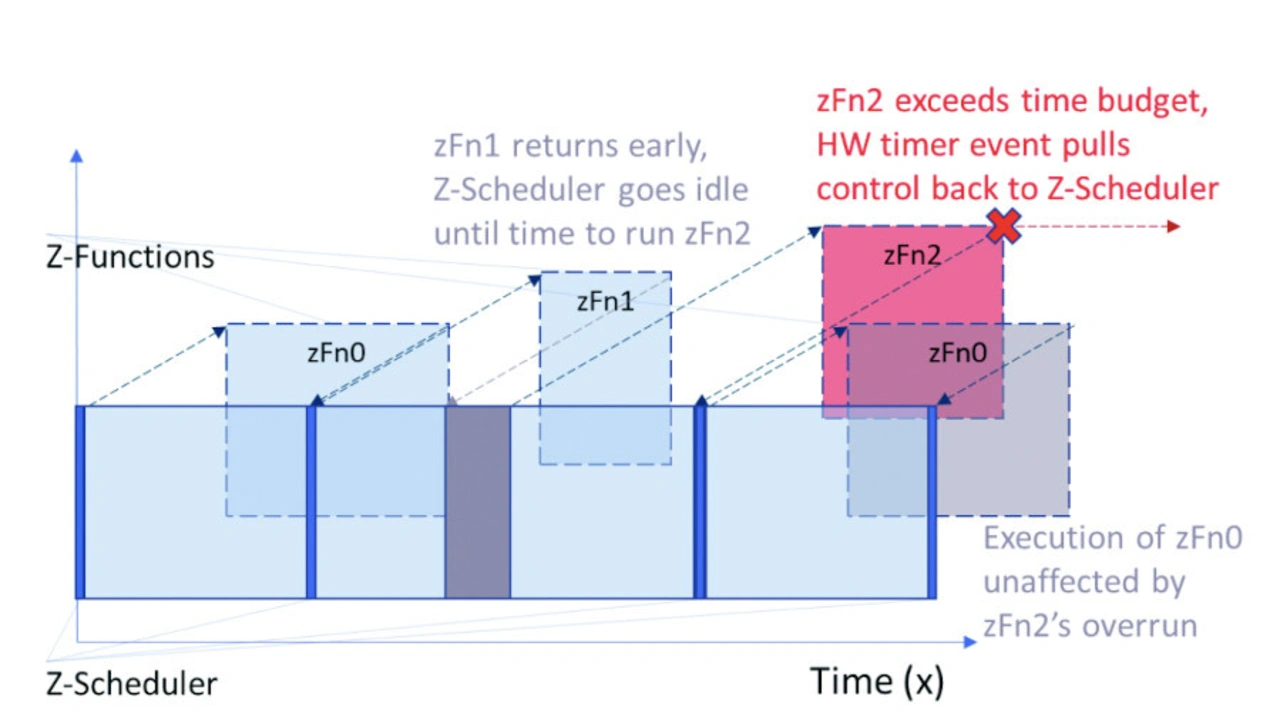 Im Gegensatz zu einem RTOS, das in der Regel die Thread-Prioritätsplanung in einem unzugänglichen »Blackbox«-Scheduler verwaltet, liegt die Planung in einer Z-App in der Verantwortung der Anwendung, die im Gastbereich in Form ihres Z-Schedulers läuft. Die Eigenschaften der Z-Apps stellen nicht nur sicher, dass die Adressraumtrennung beibehalten wird, sondern erleichtern auch die Implementierung von benutzerdefinierten Zeitplänen.