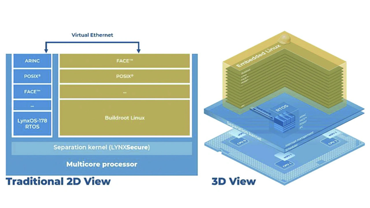 Das in Bild 7 abgebildete System zeigt einen Entwurf, der die Abstraktionsebenen minimiert und die Abhängigkeiten auf grundlegende Softwarekomponenten für sicherheitskritische Anwendungen beschränkt. Der FACE-Teil des Entwurfs hat nur begrenzten Hardware-Zugriff und wird nur für den einfachen Transport von Paketen verwendet, um die Interoperabilität des Netzes aufrechtzuerhalten, wogegen die sicherheitskritischen Bare-Metal-Anwendungen eigenständig ablaufen.