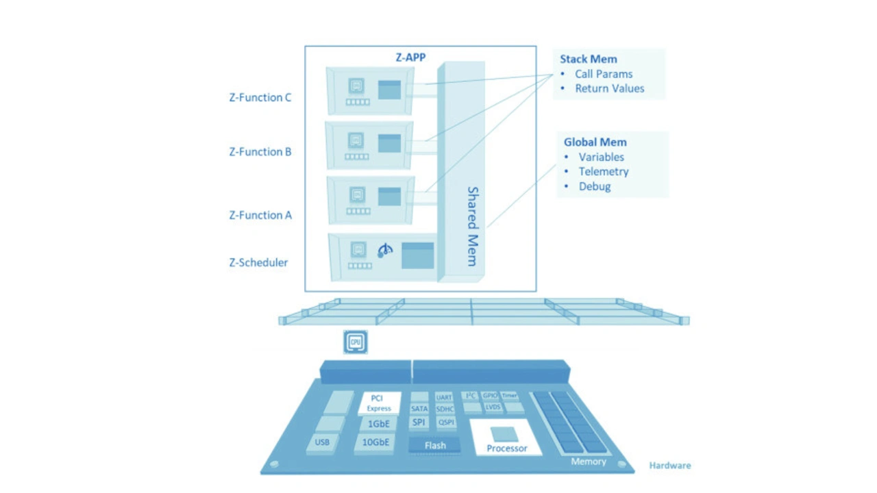 Die heutige Z-Anwendung ist eine Sammlung von virtuellen Maschinen mit einem separaten Kernel-Hypervisor, die zu einer gemeinsamen Ausführungsgruppe gehören. Jede Z-App-Instanz bildet einen konventionellen Rahmen für Bare-Metal-Anwendungen und modelliert einen Programmstapel, so dass eine Programmausführung ein Standard-Speicherlayout erstellt, um die Ausführung von Funktionen innerhalb eines Hauptprogramms zu organisieren (Bild 3).