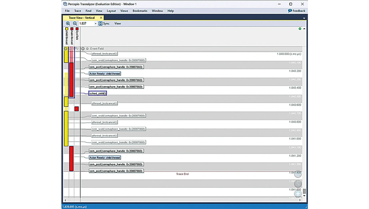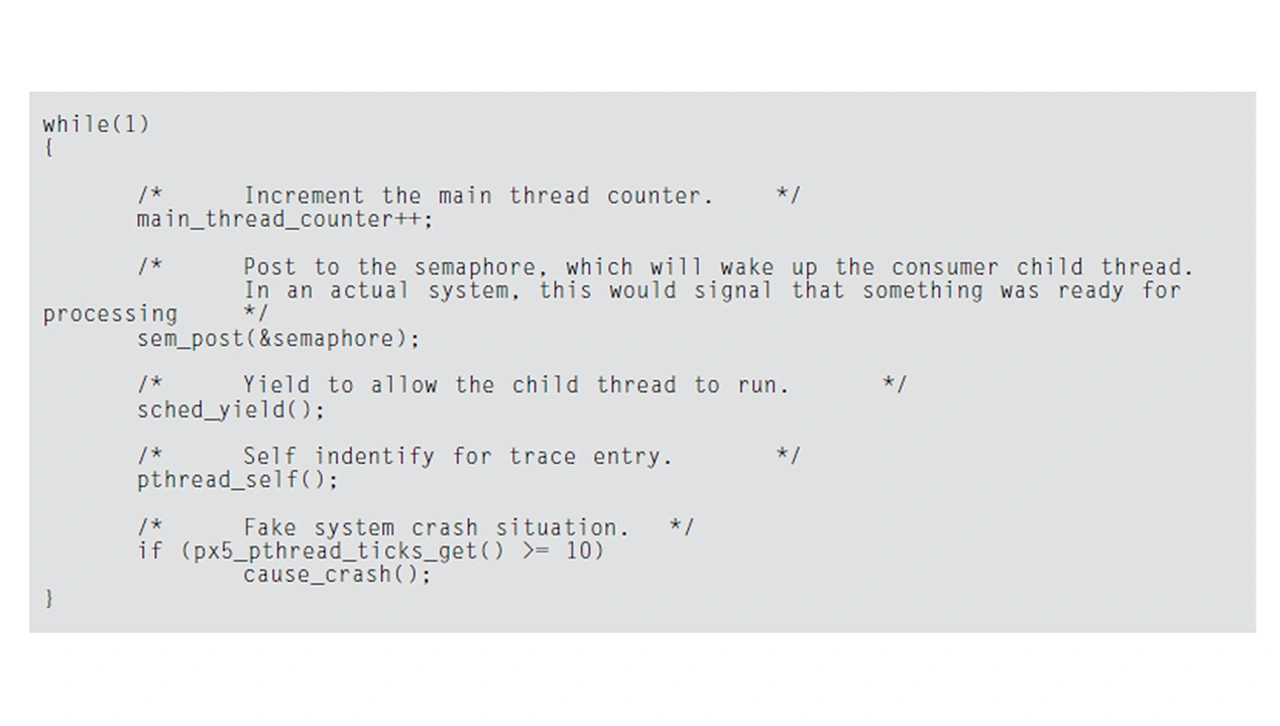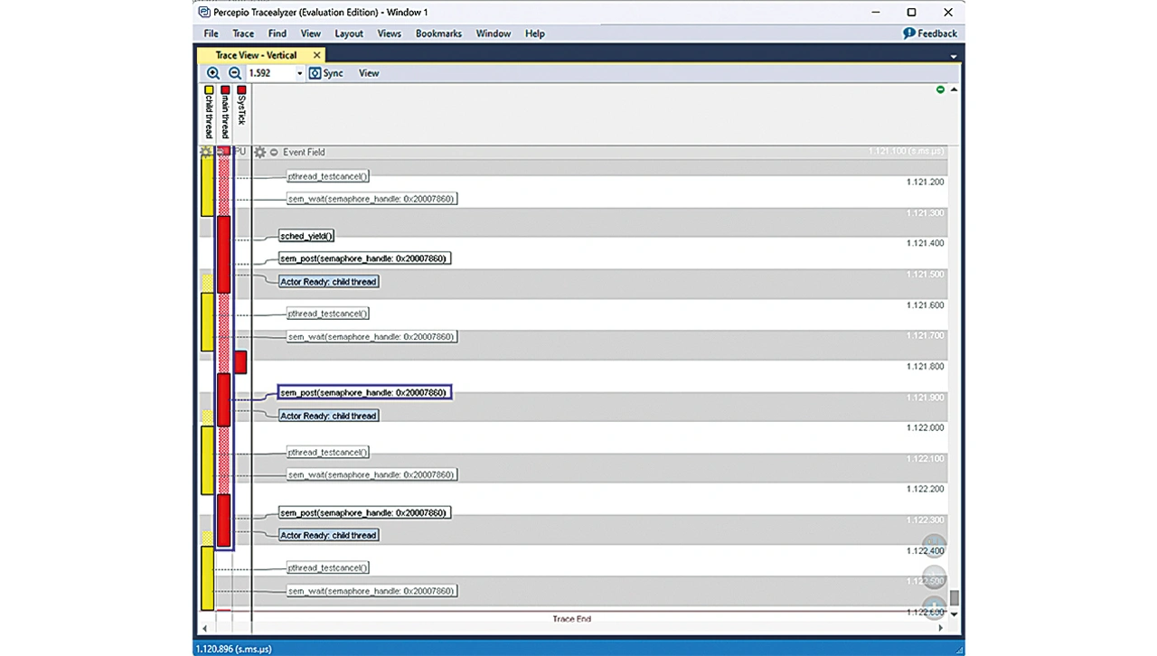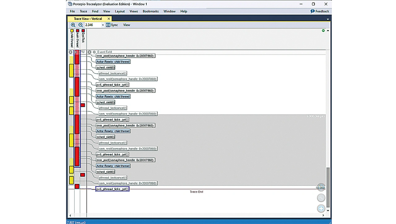 ermöglicht die Integration von PX5 RTOS mit Tracealyzer detaillierte Einblicke in die Abläufe des Systems vor dem Absturz. Zur weiteren Veranschaulichung zeigt Listing 1 ein Codeausschnitt des Beispiels »child thread«.