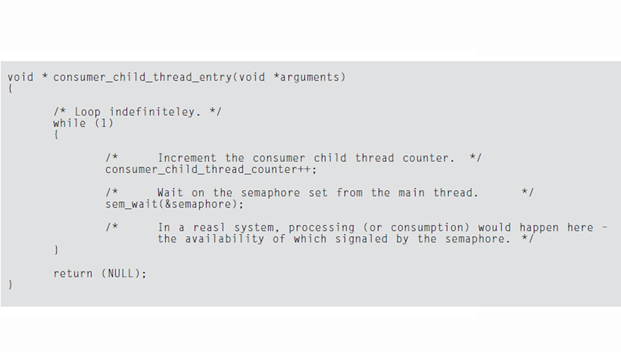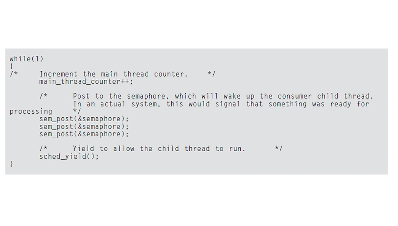 Es ist zudem schwierig, auf Systemebene zu optimieren, wenn die Verarbeitung auf Systemebene nicht verstanden wird. Die Visualisierung ermöglicht das Verständnis des Verhaltens auf Systemebene, sodass es optimiert werden kann. Als Beispiel dient nochmals der Code aus Listing 2, wobei der »main thread« das Semaphor nun dreimal statt nur einmal postet – Listing 3.