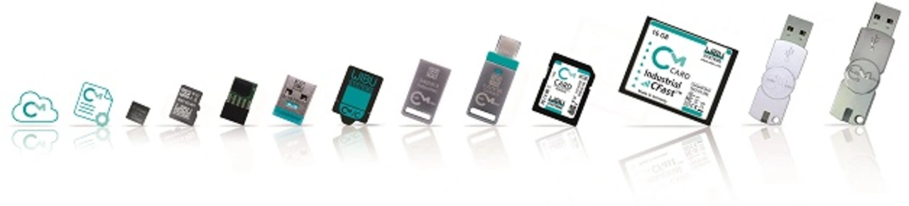 Das Herzstück eines jeden CmDongles ist ein Smartcard-Chip, der einen Mikroprozessor mit einem sicheren Speicherbereich für kryptografische Schlüssel, Passwörter und auch die Firmware enthält. Die CodeMeter-Technologie basiert auf den folgenden symmetrischen und asymmetrischen Kryptografien: AES (Advanced Encryption Standard), ECC (Elliptic Curve Cryptography) und RSA (Rivest-Shamir-Adleman). Passend zu den jeweiligen Anforderungen können Hersteller zwischen CmDongles in verschiedenen Bauformen wie USB-Stick mit und ohne zusätzlichen Flash-Speicher, als Speicherkarte für SD, microSD, CF und CFast oder als Asic wählen (Bild 2). Zusätzlich gibt es einen softwarebasierten Container und einen Cloud-Container.