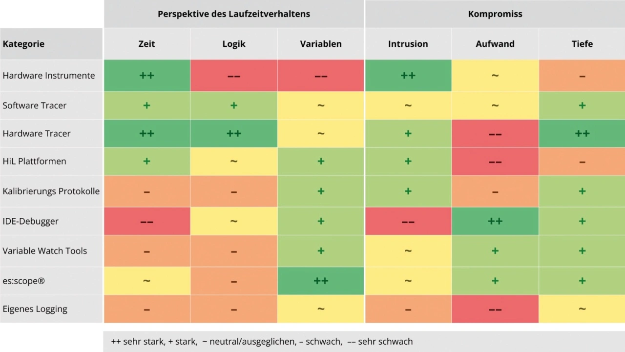 Ein Beispiel: Hardware-Tracer liefern präzise Daten fast intrusionsfrei, erfordern aber einen hohen Konfigurationsaufwand. Einfache Methoden wie Printf-Logs sind schnell integriert, bieten aber nur eine oberflächliche und teils verzerrte Sicht.