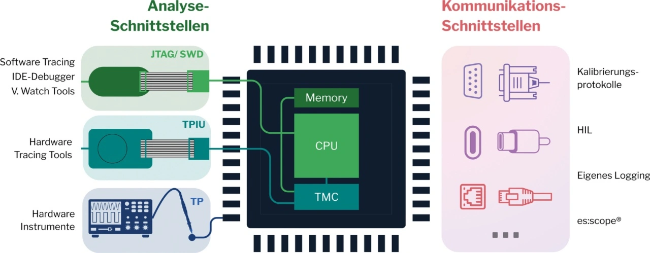 Deshalb ist es wichtig, die Tool-Landschaft zu verstehen: zu wissen, wo Tools funktionieren, wo sie an ihre Grenzen stoßen und welche Lücken in der Einsicht bleiben. Tabelle 1 zeigt die Stärken und Schwächen der Tool-Kategorien im Vergleich. Bewertet wurden die Perspektiven (Zeit, Logik, Variablen) und typische Kompromisse (Intrusion, Aufwand, Tiefe). Bild 1 zeigt die typischen Zugangswege der Tools zum Laufzeitverhalten. Diese reichen von direkten Debug- und Trace-Schnittstellen über Testpunkte bis hin zu Kommunikationsprotokollen.