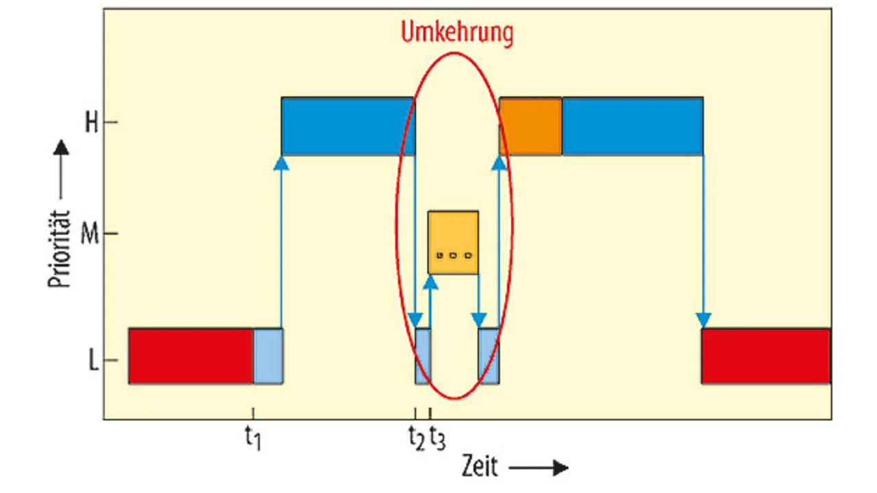 Dieses Szenario ist in Bild 2 illustriert. Zum Zeitpunkt t1 greift die Task mit der niedrigen Priorität auf die geteilte Ressource zu. Nachdem die Task mit hoher Priorität diejenige mit der niedrigsten Priorität unterbrochen hat, schlägt ihr Versuch, zum Zeitpunkt t2 auf die geteilte Ressource zuzugreifen fehl, weil die Ressource noch von der niederprioren Task blockiert ist. Also gibt der Scheduler die Kontrolle über die CPU an die niederpriore Task zurück, damit diese die Ressource frei machen kann. Schließlich kommt es dazu, dass die Task mittlerer Priorität, die kein Interesse an der von der nieder- und der hochprioren Task gemeinsam genutzten Ressource hat, zum Zeitpunkt t3 die niederpriore Task unterbricht. In diesem Moment kehren sich die Prioritäten um: Die mittelpriore Task kann die CPU beliebig lange nutzen, während die hochpriore Task auf die niederpriore Task wartet. Es kann hier sogar mehrere Tasks mittlerer Priorität geben.