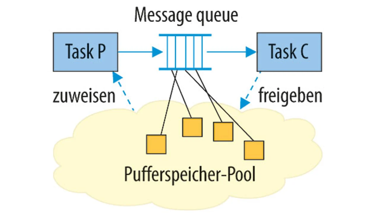 Abhilfe: Eine einfache Möglichkeit zur Vermeidung von Speicherlecks besteht darin, die Eigentümerschaft oder die Lebensdauer von Heap-zugeordneten Objekten jeglicher Art klar zu definieren. Bild 3 illustriert ein gängiges Ownership-Muster mit Puffern, die von einer produzierenden Task (P) zugeordnet, über eine Message Queue übertragen und später von einer Consumer Task (C) wieder aufgehoben werden.