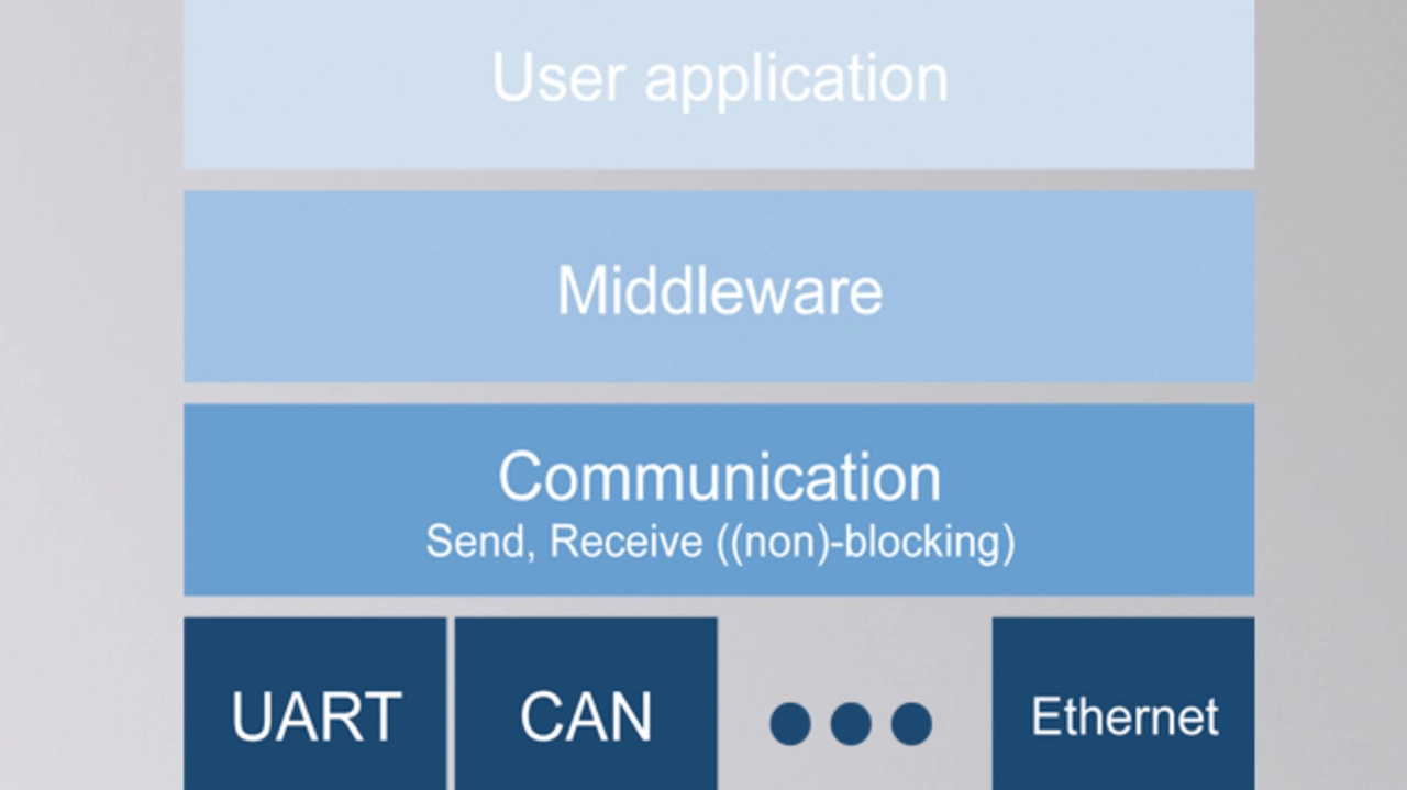 Die Experten bei Mixed Mode implementierten diese Lösung über zwei Schichten (Bild 2). Jede einzelne Schicht ist in sich abgeschlossen und hat definierte Schnittstellen nach oben und unten. Die Abstraktionsschicht der Kommunikation ist nötig, weil ein Embedded System über kein allgemeines, höheres Kommunikationsprotokoll verfügt, das gleichzeitig sehr schlank wäre, also den begrenzten Speicher und die Rechenzeit nicht belastet. Durch das Schichtenmodell werden die physikalische Kommunikation und die Applikation unabhängig von der entwickelten Middleware. Welche Übertragungsart genutzt wird, ist somit irrelevant für die Middleware, da die einfachen Treiber die Daten über die definierten Schnittstellen an die Kommunikationsschicht weiterleiten. Wenn die im System befindlichen Controller über einen TCP/IP-Stack verfügen, können sie natürlich TCP/IP statt der Kommunikationsschicht (Communication) nutzen.