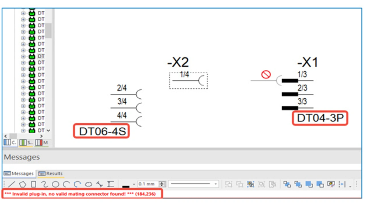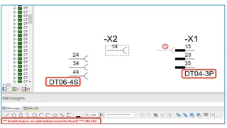 Im Bereich Schaltplan und Verkabelung wurden mit dem neuen Release zusätzliche Online-Prüfungen für das manuelle Stecken von Steckern eingeführt, die das Pendant zur automatischen Auswahl von Gegensteckern aus der Datenbank in E3.series darstellen. Wird ein Steckverbinder manuell zugewiesen oder geändert, sucht die Fehlerprüfungsfunktion nun in der Datenbank nach geeigneten Gegensteckern und gibt eine Warnung aus, wenn ein inkompatibler Steckverbinder ausgewählt wurde (Bild 1). Die Prüfungen verhindern auch das manuelle Verbinden von Stecker auf Stecker oder Buchse.