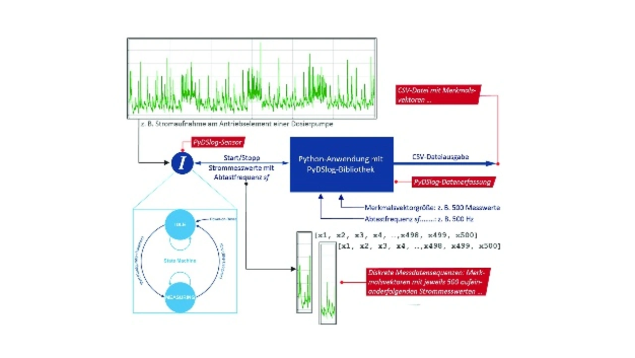 PyDSlog ist ein Baukasten aus Wissens- und Software-Funktionsbausteinen zur Aufzeichnung von beliebigen Sensormesswerten in CSV-Dateien, um die Sensorrohdaten zum einen für explorative und deskriptive Datenanalysen sowie zum anderen für das Training von ML-Algorithmen zu nutzen. Mit Hilfe des durch die Trainingsphase entstandenen Machine-Learning-Modells kann anschließend eine Inferenzmaschine im Praxiseinsatz bestimmte Muster in Echtzeitmessdaten identifizieren und Ereignisse per Klassifizierung oder Regression vorhersagen. Für die CSV-Datei wird jede einzelne Sensormessung als Zahlenwert in einen Merkmalsvektor eingefügt. Ein solcher Vektor (Array aus diskreten Zahlenwerten) repräsentiert die Messwerte an den jeweiligen Sensorikeingängen zu einem bestimmten Zeitpunkt.