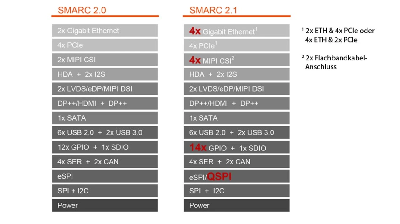 Die neuen Funktionen sind rückwärtskompatibel zur Rev. 2.0. Das bedeutet, dass 2.1-Module auch auf 2.0-Carriern betrieben werden können. Alle Erweiterungen zur Rev.2.0 sind zudem optional, sodass alle SMARC-2.0-Module automatisch auch SMARC-2.1-kompatibel sind.