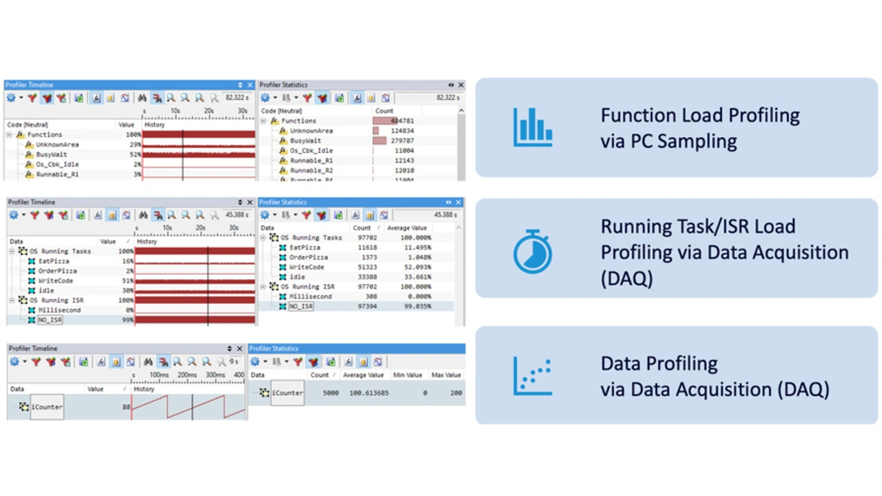 Das Sampling-based Profiling ist kein Ersatz für echtes Hardware-Trace, da es nicht garantieren kann, dass alle relevanten Ereignisse erfasst werden. Es ist jedoch das perfekte Tool für statistische Analysen oder für das Sampling sich langsam ändernder Variablen in einem System und hilft Entwicklern dabei, ihren Testaufwand weiter zu optimieren.