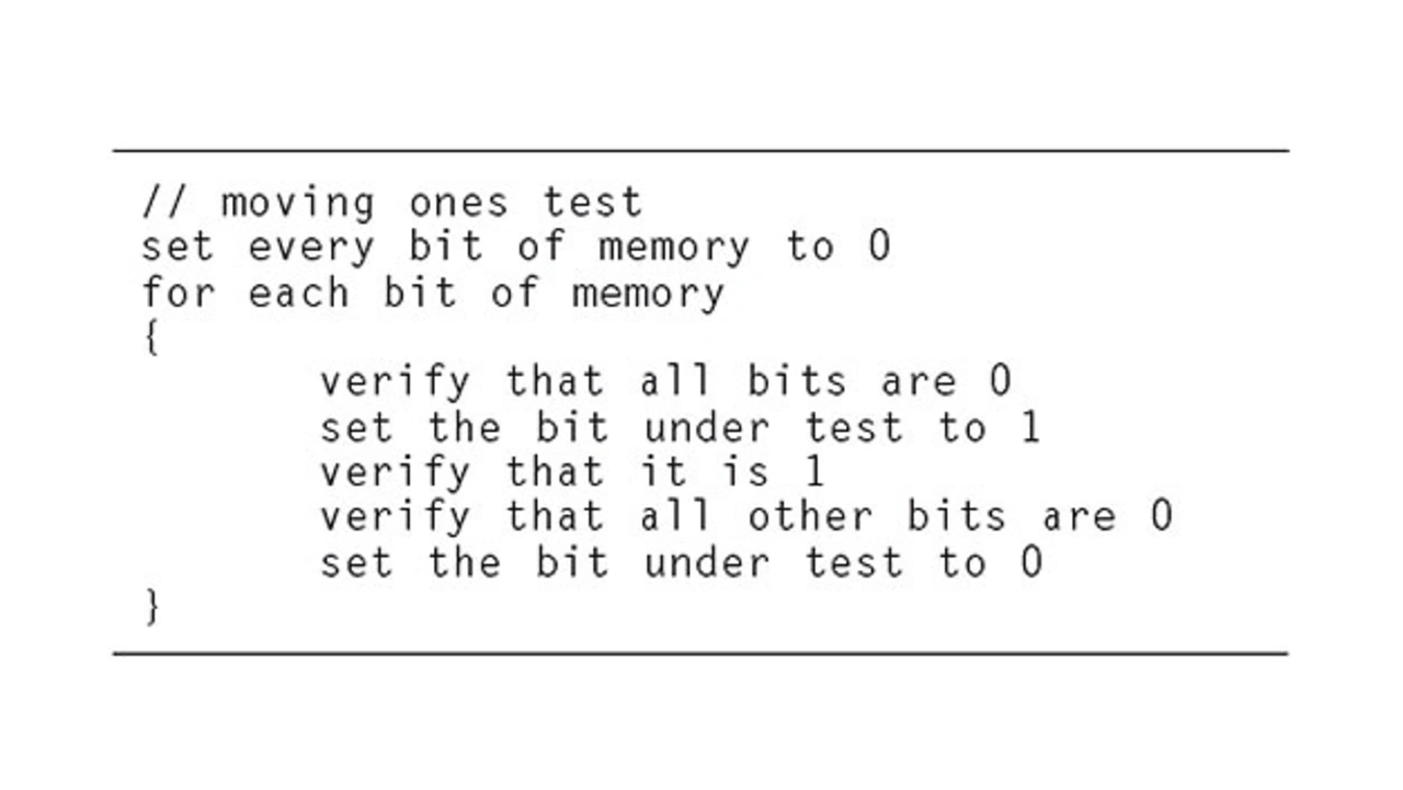 Ein »Moving Ones«-Test – oder »Moving Zeroes« nach demselben Prinzip – prüft, ob jedes Bit des Speichers nicht verklemmt ist und ob es kein Übersprechen gibt (Listing 1).