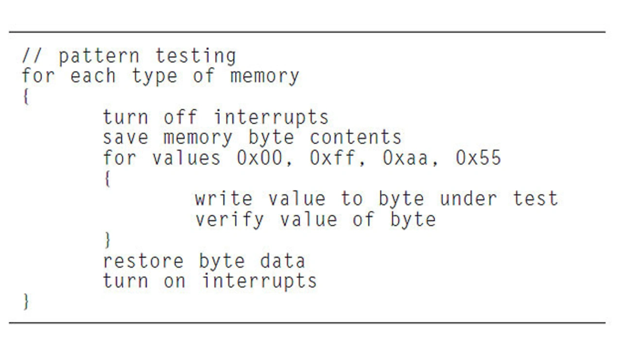 Diese Art von Test kann zeitaufwendig sein, aber da ein Übersprechen zwischen Speicher-ICs weniger wahrscheinlich ist, kann der Test optimiert werden, wenn der Speicheraufbau bekannt ist. Außerdem muss der Code für diesen Test aus dem ROM (Flash-Speicher) ausgeführt werden und alle Daten müssen in Maschinenregistern gehalten werden.