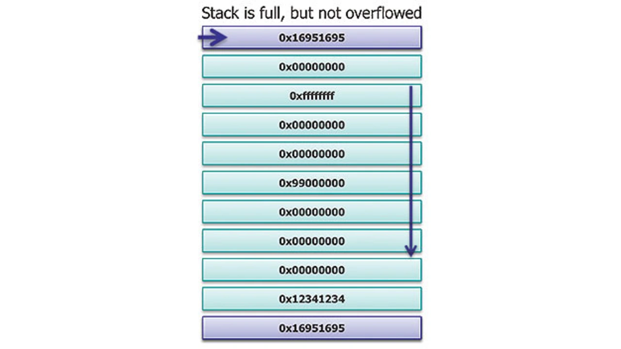 Wenn der Stack voll ist, zeigt der Stack-Zeiger auf das Schutzwort. Wenn ein weiteres Element auf den Stack geschoben wird, wird das Schutzwort beschädigt. Der Überwachungscode kann Maßnahmen ergreifen, bevor es zu einem Absturz (eines anderen Tasks) kommt.