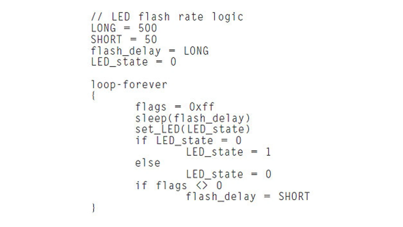 Ein guter Ansatz ist ein gleichmäßiger langsamer »Herzschlag«, um zu zeigen, dass das System normal funktioniert. Schnellere Blinkraten können verwendet werden, um einen Fehler anzuzeigen. Verschiedene Tastverhältnisse – Serien von Blinksignalen gefolgt von einer Pause – können verwendet werden, um verschiedene Fehler anzuzeigen (Listing 3).
