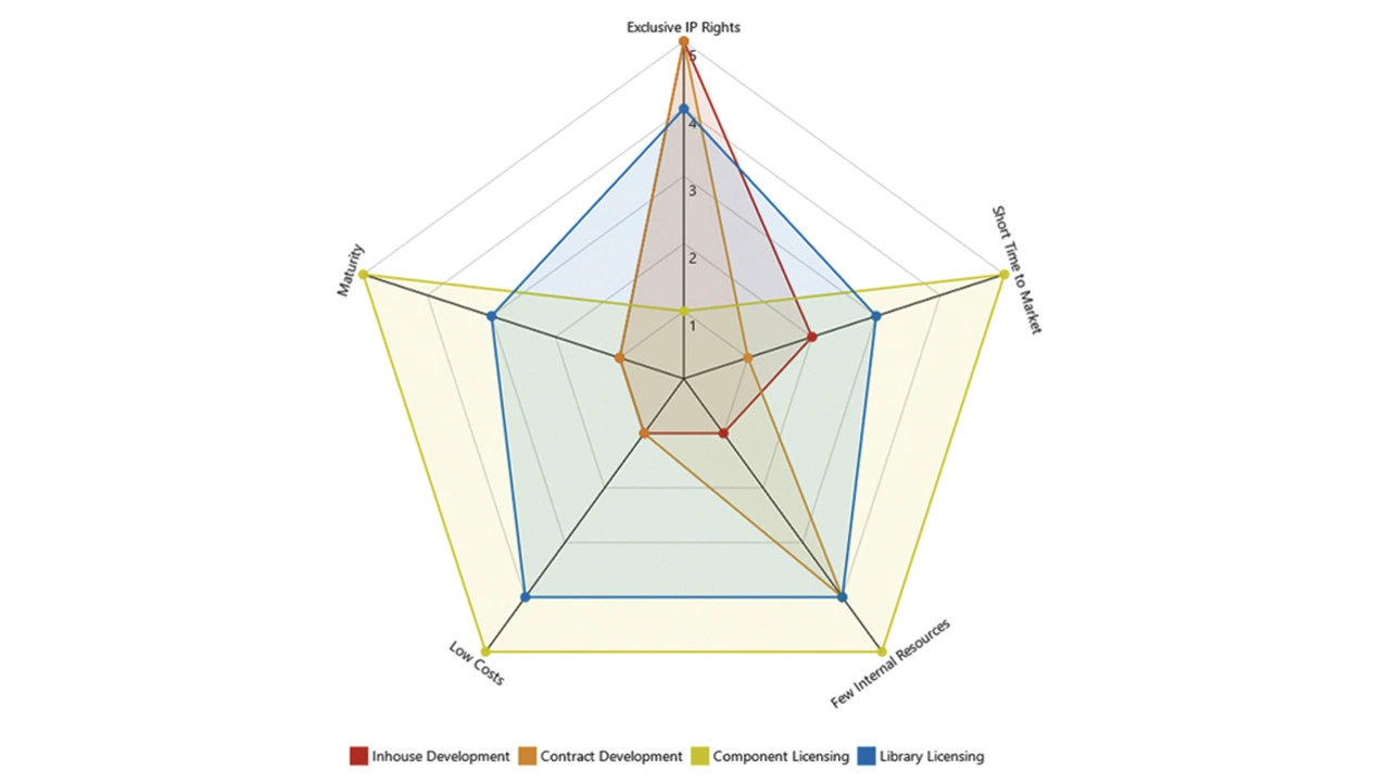 Die Komplexität der Beschaffung von Software und Softwarekomponenten und die Vor- und Nachteile der verschiedenen Beschaffungsstrategien verdeutlicht Bild 2 in einer Grafik: Die Lizensierung von Komponenten ist eindeutig von Vorteil, wenn diese kommerziell verfügbar sind, wogegen die Eigenentwicklung der Software eine gezielte Ergänzung sein kann. Die Lizensierung von Bibliotheken hingegen kann das Beste aus beiden Welten vereinen.