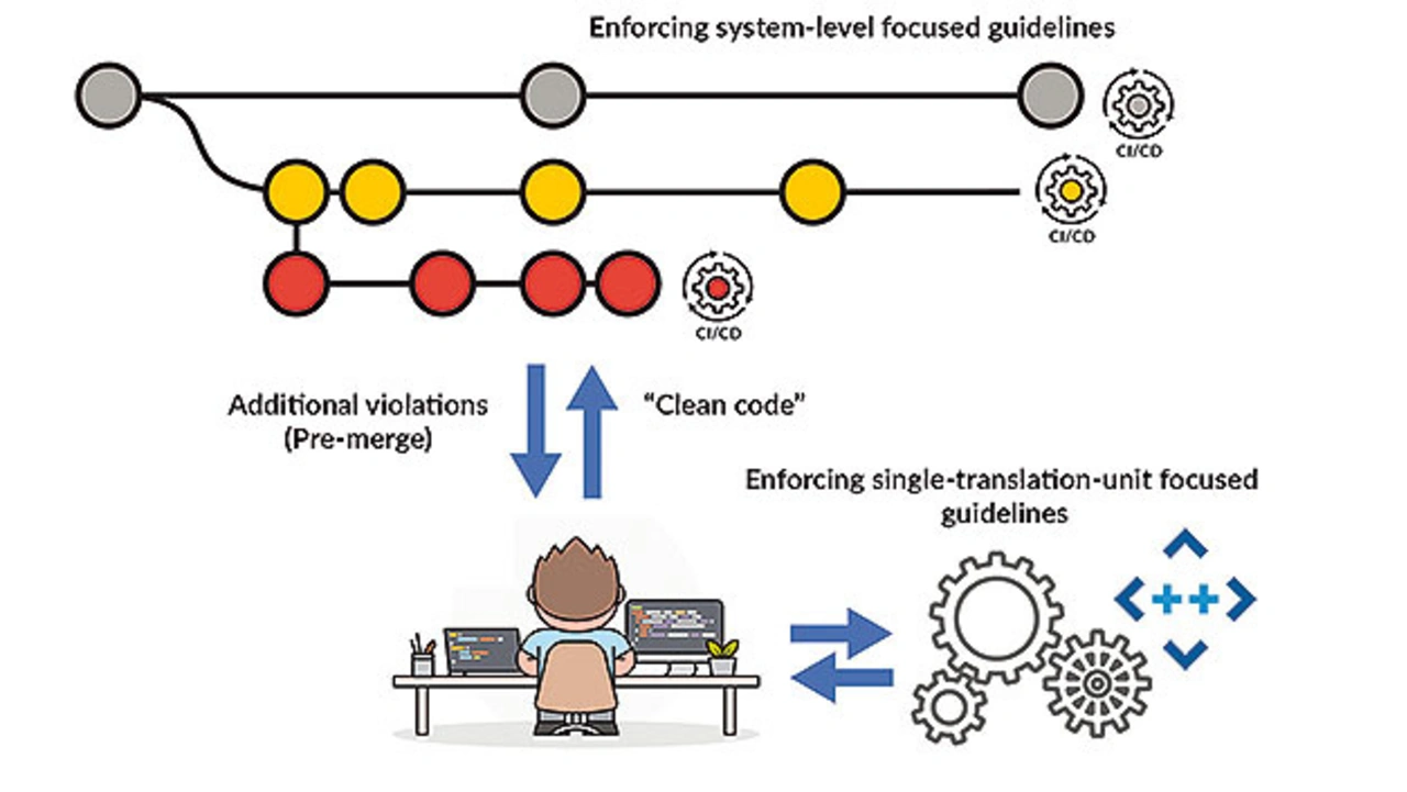 Die Strategie geht davon aus, dass für die einzelne Übersetzungseinheit aktivierte Checker von den auf der Systemebene laufenden getrennt sind, und als zwei Konfigurationen dargestellt werden. Die Checker-Konfiguration für einzelne Übersetzungseinheiten wird bei schnellen lokalen Scans auf dem Rechner des Entwicklers angewendet. Für die Systemebene konfiguriert werden Checker auf leistungsfähigeren Rechnern eingesetzt, um Programmierstandards in den