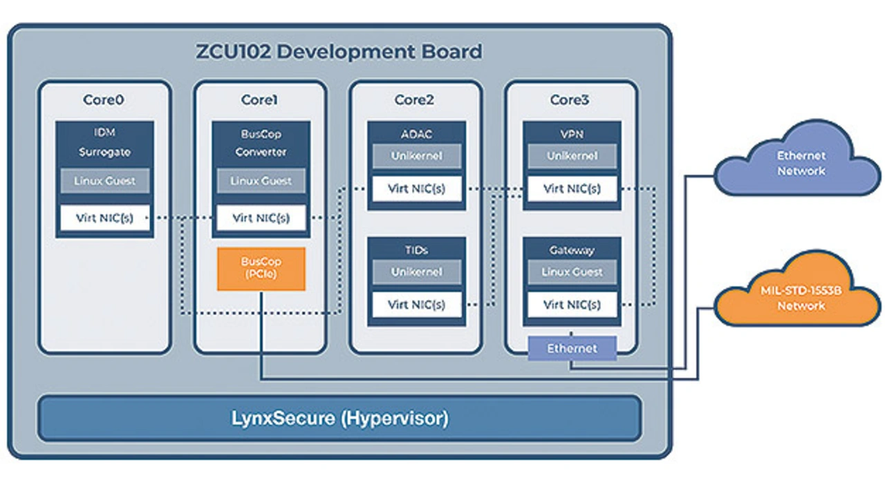 IDS (Intrusion Detection System) und VPNs (Virtual Private Network) verwendet werden. Bild 2 zeigt, wie dies auf einem Xilinx-Entwicklungsmodul implementiert werden könnte. TIDS (Tactical Intrusion Detection System) und Dynamic Access Control (DAC) sind statistische Anomalie-Detektoren, die von der US-Armee in einigen ihrer Netze eingesetzt werden und den IP- und 1553-Datenverkehr überwachen. Die Verwendung einer Datendiode und eines Filters auf dem Unikernel würde es einem Kunden ermöglichen, eine Linux-VM zu ersetzen, was Speicherplatz spart und den Angriffsraum drastisch reduziert.