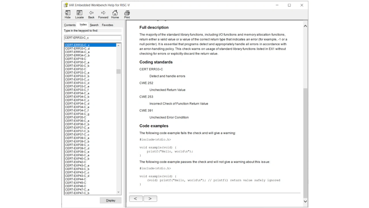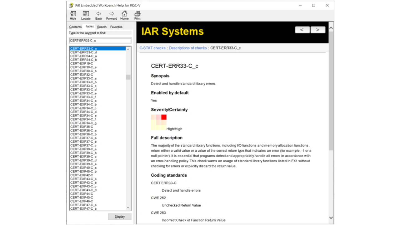 Das erkannte Problem CERT-ERR33-C_c in Bild 5 gehört zu den CERT-C-Regeln. Die meisten Regeln sind selbsterklärend, aber weitere Informationen können in den Anwenderhandbüchern oder in der kontextsensitiven Hilfe (F1) gefunden werden, wie in Bild 6 dargestellt.