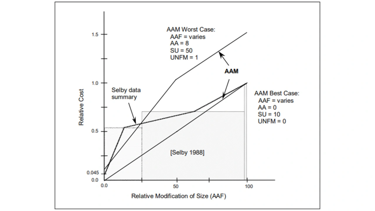 Die in Bild 1 dargestellte COCOMO-Methode von Boehm schätzt ab, wie stark die relativen Kosten für die Erstellung des Codes davon abhängen, wie viele Änderungen an der wiederverwendeten Software vorgenommen werden. Die x-Achse gibt an, wie viel Prozent des wiederzuverwendenden Codes geändert werden. Die y-Achse zeigt die prozentualen Kosten, die bei einem neu geschriebenen Code entstehen würden. In zwei der drei Codebeispiele müsste nicht viel an dem vermeintlich wiederverwendeten Code geändert werden, um plötzlich 50 % des Aufwands zu erreichen, der beim Neuschreiben des Codes anfällt. Der springende Punkt dabei ist, dass die Wiederverwendung von Code nur dann effizient ist, wenn dieser von hoher Qualität und gut entwickelt ist.