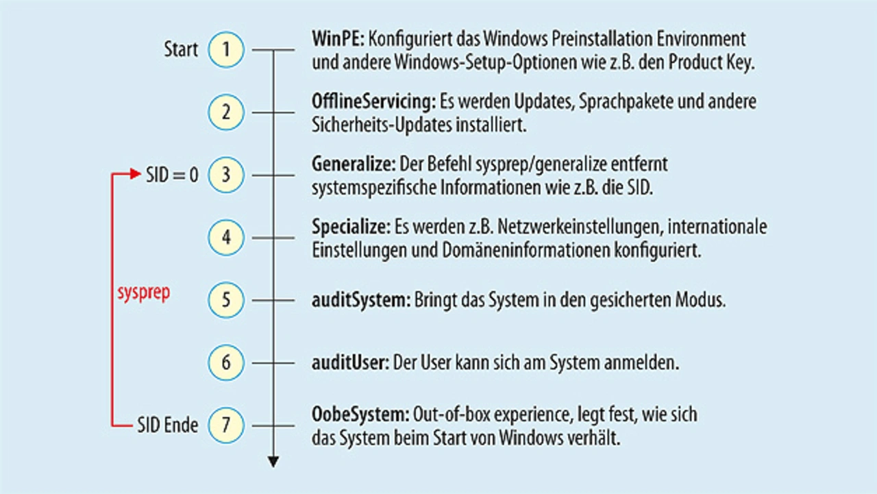 Wie im Bild 3 auch zu erkennen ist, muss nicht direkt hinter der Phase 7 ein SysPrep ausgeführt werden. Es können auch weitere Konfigurationen und Installationen von Applikationen auf dem laufenden System vorgenommen werden und danach erst ein SysPrep ausgeführt werden.