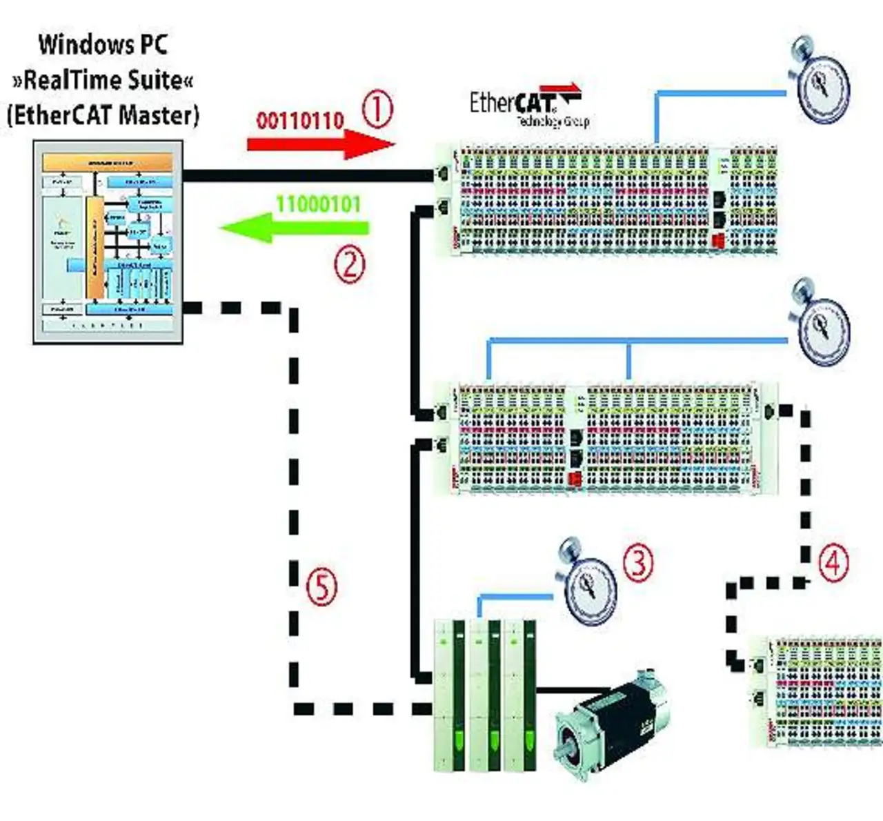 Diese sind durch einen Namen eindeutig identifiziert und besitzen einen festgelegten Datentyp. Die Werte der Variablen sind les- und/oder beschreibbar. Es soll nicht unerwähnt bleiben, dass der EtherCAT-Master der RealTime Suite auch einige besondere Betriebsarten unterstützt, wie zum Beispiel Distributed-Clocks für zeitlich hochgenaue und synchronisierte Vorgänge. Das System ist zudem hot-plug-fähig, die Topologie kann sich also während der Laufzeit ändern. Ein Kabelredundanz-Modul erhöht die Systemverfügbarkeit.