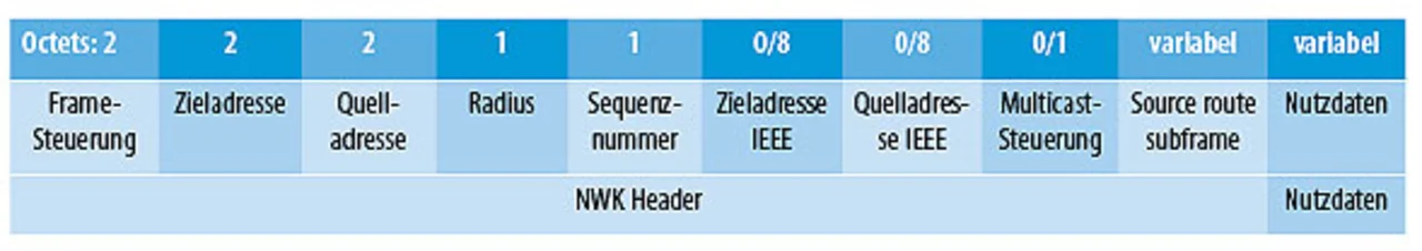 Deutlich kritischer ist die Paketgröße der späteren Datenpakete. Ein Paket besteht bei ZigBee aus mindestens folgenden Daten (Bild 2):