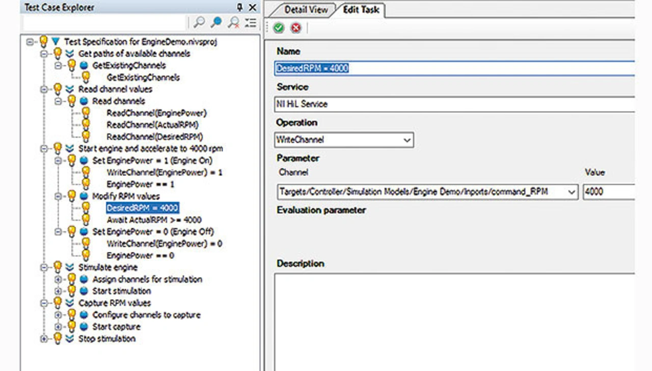 Das Beispiel in Bild 2 zeigt den Test eines Motorsteuergeräts. Rechts im Bild 2 ist exemplarisch das Fenster zum Testtask »DesiredRPM = 4000« dargestellt. Die Motordrehzahl soll auf den definierten Wert gesetzt werden. In dem Testtask wird dazu die Operation WriteChannel aus dem NI-HiL-Service und der Wert 4000 für das Eingangssignal command_RPM aufgerufen. Mit diesem Verfahren können Testfälle für alle Komponenten und Tools in der HiL-Umgebung auf einfache Art erstellt und über die zentrale Benutzeroberfläche verwaltet werden.