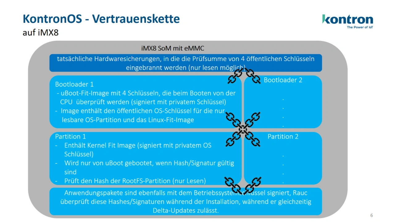Unter der Bezeichnung »KontronOS« hat Kontron ein spezialisiertes Betriebssystem geschaffen, das Sicherheitsarchitektur, Modularität und Wartbarkeit auf industrielle Anforderungen ausrichtet. Das sichere, gehärtete Betriebssystem auf Linux-Basis wurde für Edge Devices entwickelt und dient als stabile Grundlage für Kundenanwendungen in sicherheitskritischen Umgebungen. Im Mittelpunkt steht eine strikt abgesicherte Systemumgebung, die ausschließlich autorisierte Softwarekomponenten zulässt. Überflüssige Funktionen werden systematisch entfernt, potenziell angreifbare Schnittstellen konsequent deaktiviert. »Wir beschränken das System konsequent auf die Komponenten, die für die jeweilige Maschinenfunktion erforderlich sind – alles darüber hinaus wird entfernt«, erklärt Stefan Eberhardt. Die Architektur von KontronOS trennt Anwendungen voneinander ab, sodass potenzielle Kompromittierungen nicht auf andere Systembereiche übergreifen können.