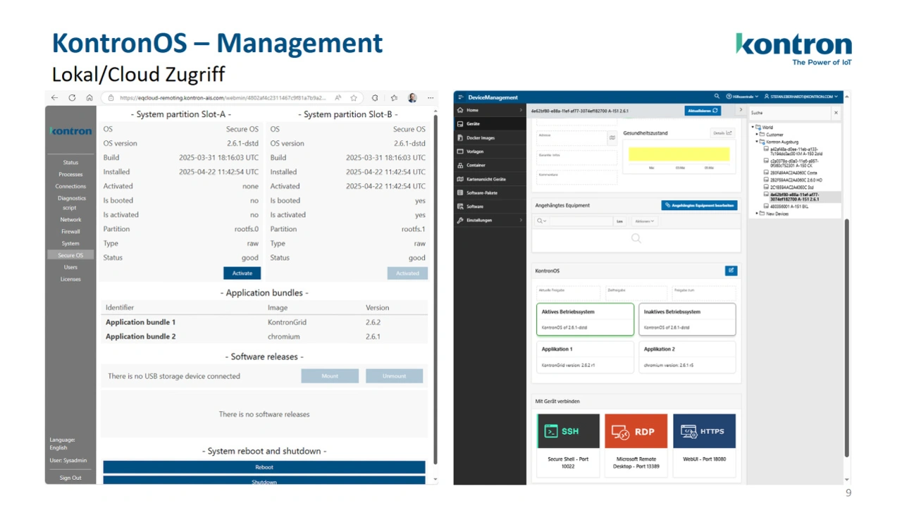KontronGrid ergänzt KontronOS und KontronAIShield durch zentralisiertes Management. Unternehmen mit verteilten Systemen können ihre Geräteflotten einheitlich überwachen, aktualisieren und kontrollieren. Über das System lassen sich Softwarestände prüfen, Richtlinien einspielen und Sicherheits-Updates gezielt ausliefern.