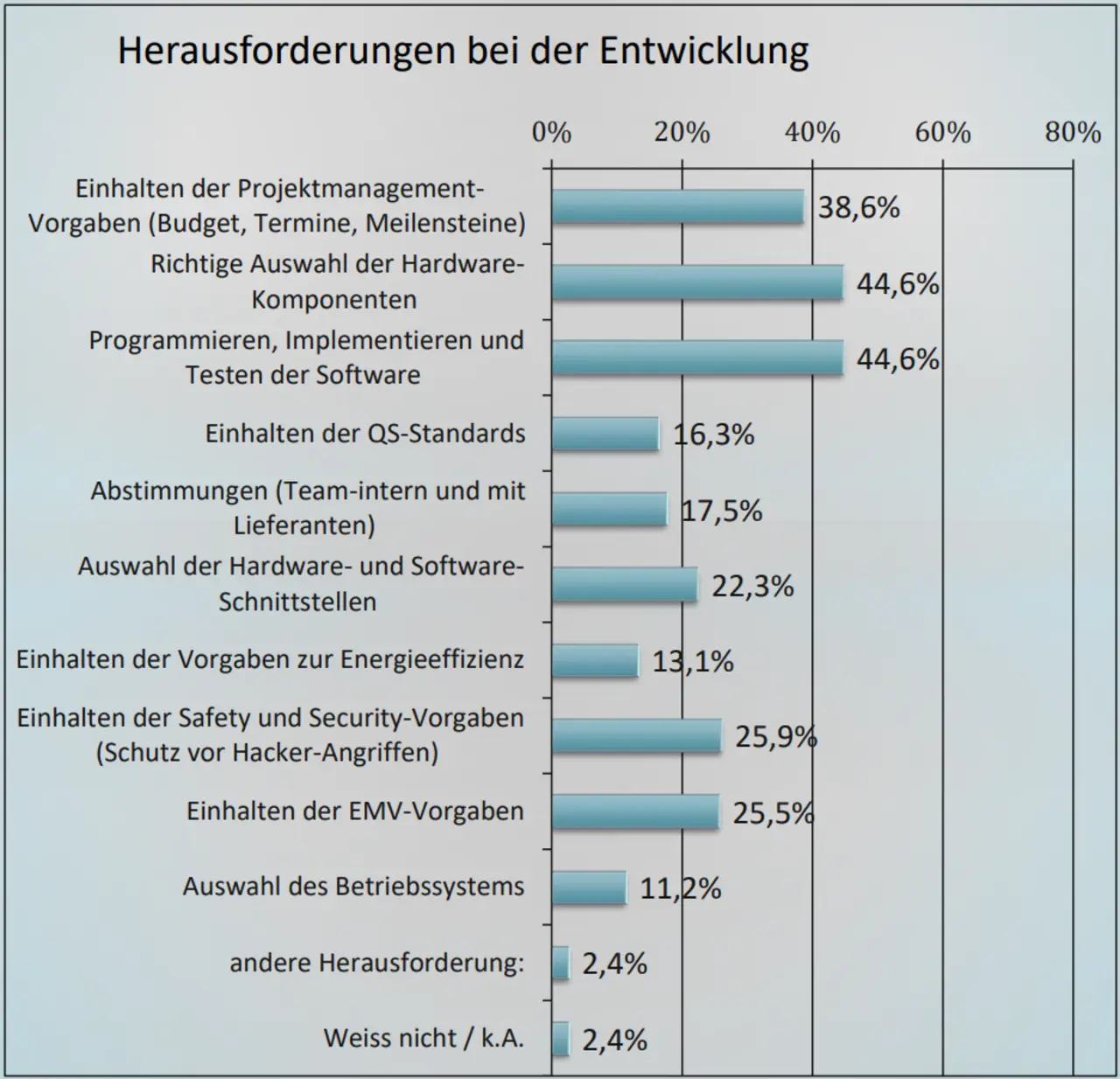 Gründe dafür sind allerdings oft im Projektmanagement zu finden, zum Beispiel über- oder unterschätzen viele den Aufwand für ein Arbeitspaket. Etwa 40 Prozent sehen jedoch ebenso Schwierigkeiten bei der Software. Das bestätigt die Aussage, die Software sei eine der größten Herausforderungen beim Umsetzen eines Embedded-Projekts. Auch Lieferverzögerungen von Bauteilen oder von Hardware sind vielfach für verspätet abgeschlossene Projekte verantwortlich, ebenso Abstimmungsprobleme im Team.