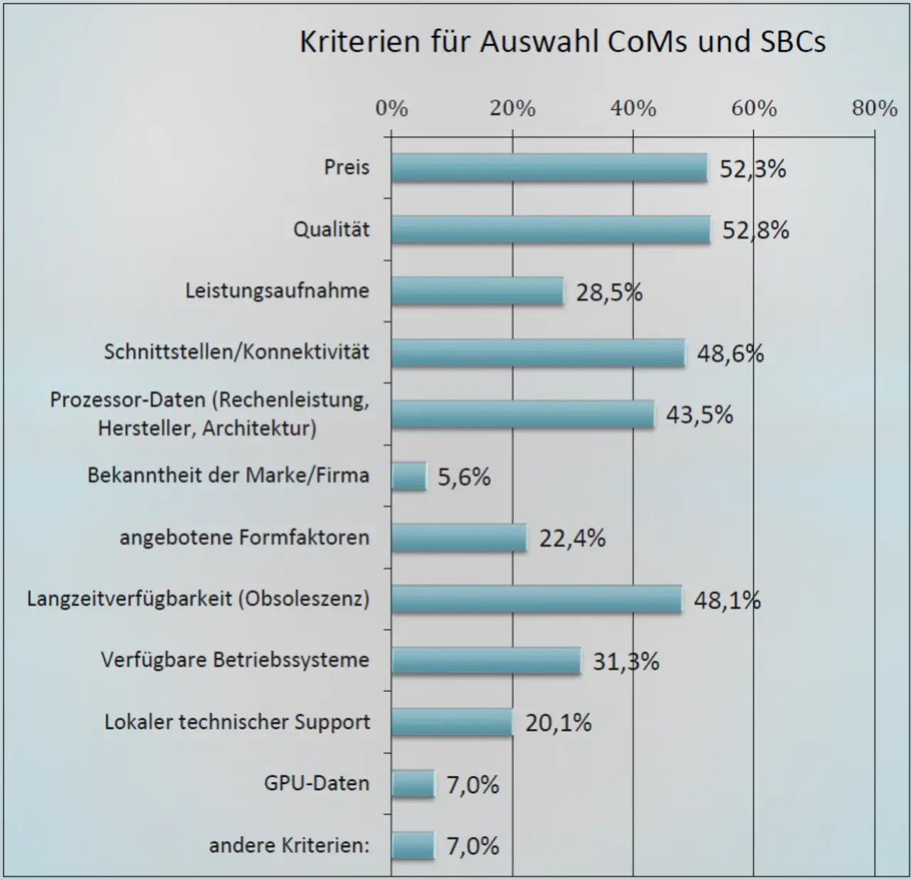 Für eine schnelle Systementwicklung vertrauen Embedded-Entwickler gerne fertigen Computermodulen oder Single Board Computern (SBCs). Hierbei können sie auf eine große Auswahl an Herstellern, Formfaktoren und Leistungsbereichen zurückgreifen. Deshalb stellte die Elektronik die Frage nach den Auswahlkriterien für CoMs und SBCs. Das Ergebnis: Entwicklern sind Preis, Qualität und Schnittstellen am wichtigsten bei der Wahl der Module. Wichtig sind ihnen außerdem, wie lange ein Modul verfügbar, welcher Prozessor eingesetzt und wie hoch die Leistungsaufnahme ist (Bild 2).
