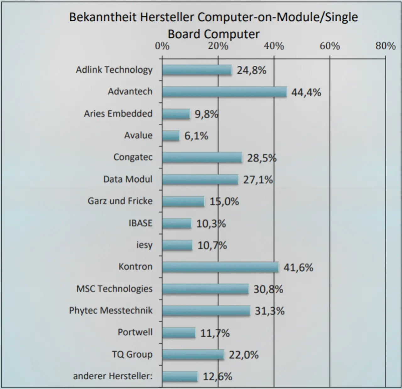 Beliebteste Hersteller von Computermodulen und SBCs sind Advantech, Kontron und Phytec Messtechnik. MSC Technologies, Congatec und Data Modul liegen jedoch nur knapp dahinter (Bild 3). Bei den Formfaktoren hat ein Entwickler oft die Qual der Wahl – SMARC, COM oder Qseven? Gerade im Bereich Edge Computing rückt außerdem COM-HPC immer mehr in den Fokus. Jedoch setzt die große Mehrheit – knapp 30 Prozent – auf COM Express, gefolgt von PC/104, 104-Express oder 104-Plus. SMARC ist mit 8 Prozent auf dem dritten Platz, COM-HPC erreicht bereits 5,4 Prozent, wird allerdings in den nächsten Jahren weiter zulegen. Bei den SBCs sind kundenspezifische Designs am stärksten nachgefragt (etwa 30 Prozent), gefolgt von den Formfaktoren Mini-ITX (26,1 Prozent) sowie 3,5 Zoll (12,5 Prozent).