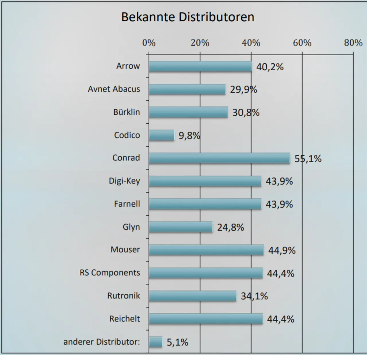 Im Zuge einer Embedded-Systementwicklung stellt sich über kurz oder lang die Frage: Kaufe ich meine fertigen Module direkt beim Hersteller oder beim Distributor? Genauso viele Entwickler vertrauen dem Hersteller wie dem Distributor, etwa ein Fünftel kauft außerdem bei beiden ein. Bekanntester Distributor im Bereich CoMs und SBCs ist Conrad (Bild 4). Auf den weiteren Plätzen folgen Digi-Key, Farnell, Mouser, RS Components und Reichelt. Überzeugen kann ein Distributor den Entwickler vor allem mit seinem Produktsortiment, den Preisen und seinem Lieferservice. Die Liste der Bekanntheit spiegelt sich ebenfalls bei der Frage nach den tatsächlich ausgewählten Distributoren wider.