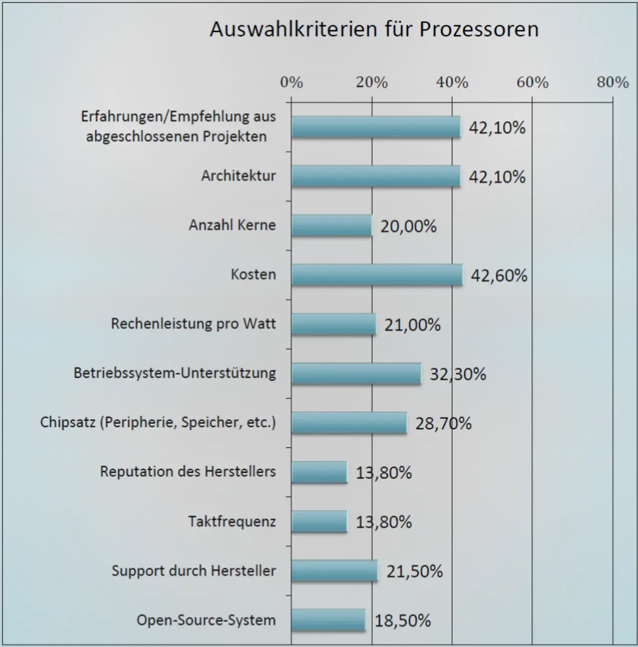 Hat sich der Entwickler für einen Formfaktor und den Distributor entschieden, stellt sich noch die Frage nach dem richtigen Prozessor. Meist lautet sie: AMD oder Intel? Hier liefert unsere Umfrage keine eindeutige Antwort – AMD liegt bei der Beliebtheit mit 66 Prozent knapp vor Intel mit 62 Prozent. Andere Chiphersteller wie Infineon, Nvidia oder Qualcomm liegen bei etwa 40 Prozent – hierbei ist zu beachten, dass Mehrfachnennungen möglich waren. Es gibt also keinen klaren Sieger, jedoch führen AMD und Intel das Feld an.