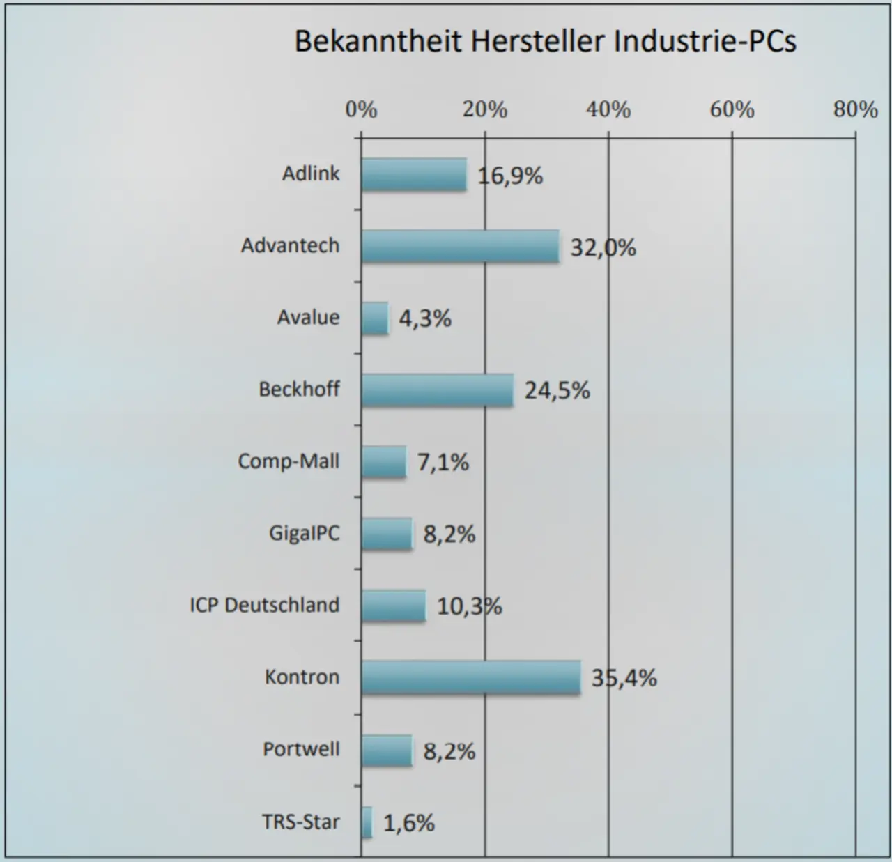 Auch bei den IPCs fragte die Elektronik nach dem bekanntesten Hersteller: Advantech und Kontron sind führend, gefolgt von Beckhoff Automation (Bild 6). Einzig ADLink kann noch folgen, Avalue, Compmall oder ICP Deutschland liegen weit zurück. Beim Implementieren eines IPC-Systems setzen Entwickler vor allem auf den richtigen Prozessor, die Qualität der Schnittstellen sowie die Langzeitverfügbarkeit der Bauteile.