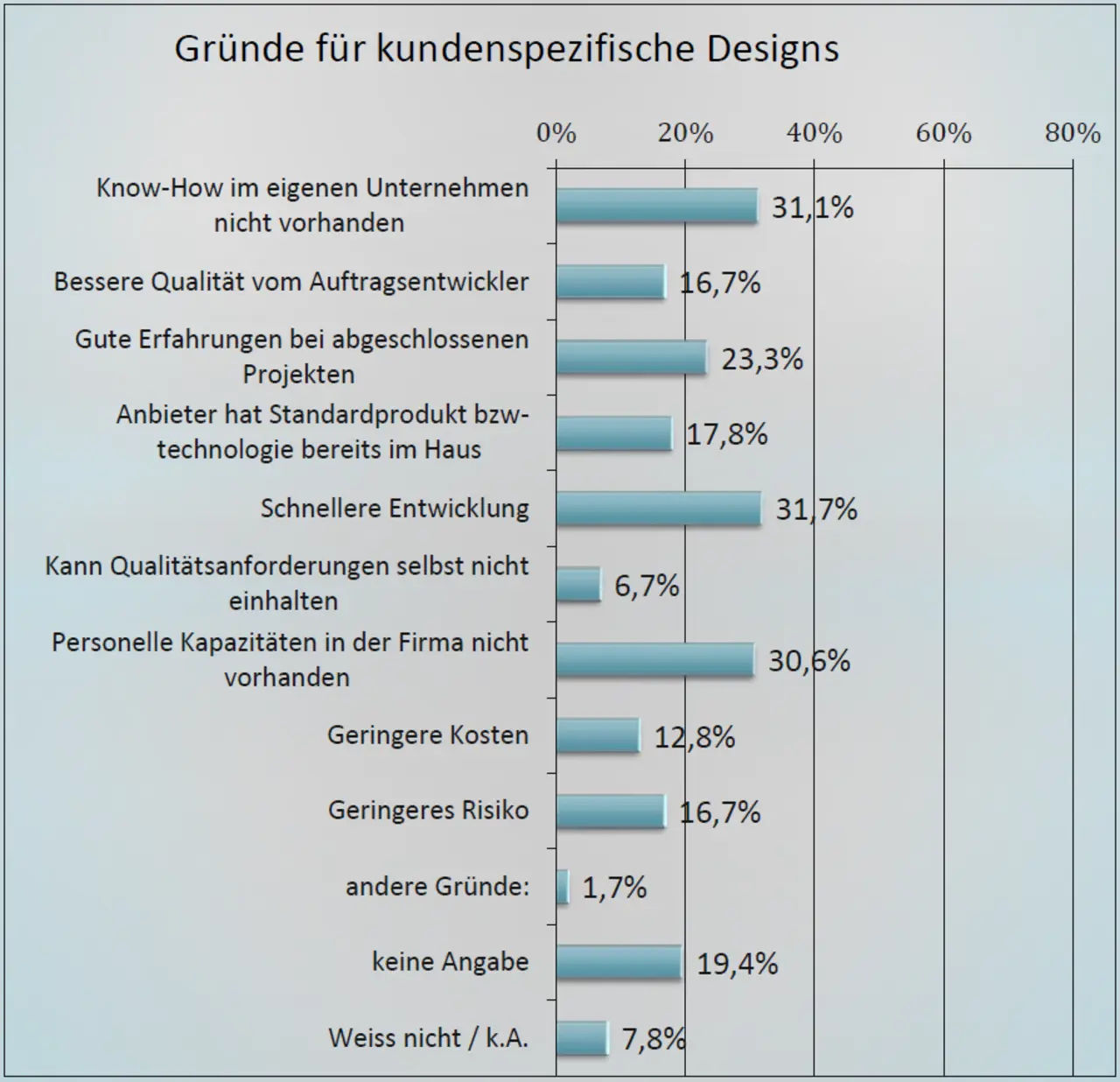 Viele Unternehmen haben entweder nicht mehr die Zeit oder die Ressourcen, um ein Embedded-System eigenständig zu entwickeln. Außerdem wollen viele die Time to Market verkürzen. Eine gute Möglichkeit bieten hierbei kundenspezifische Designs. Immerhin ein Viertel hat schon einmal ein kundenspezifisches Design entwickeln lassen oder zumindest Teile in Auftrag gegeben.