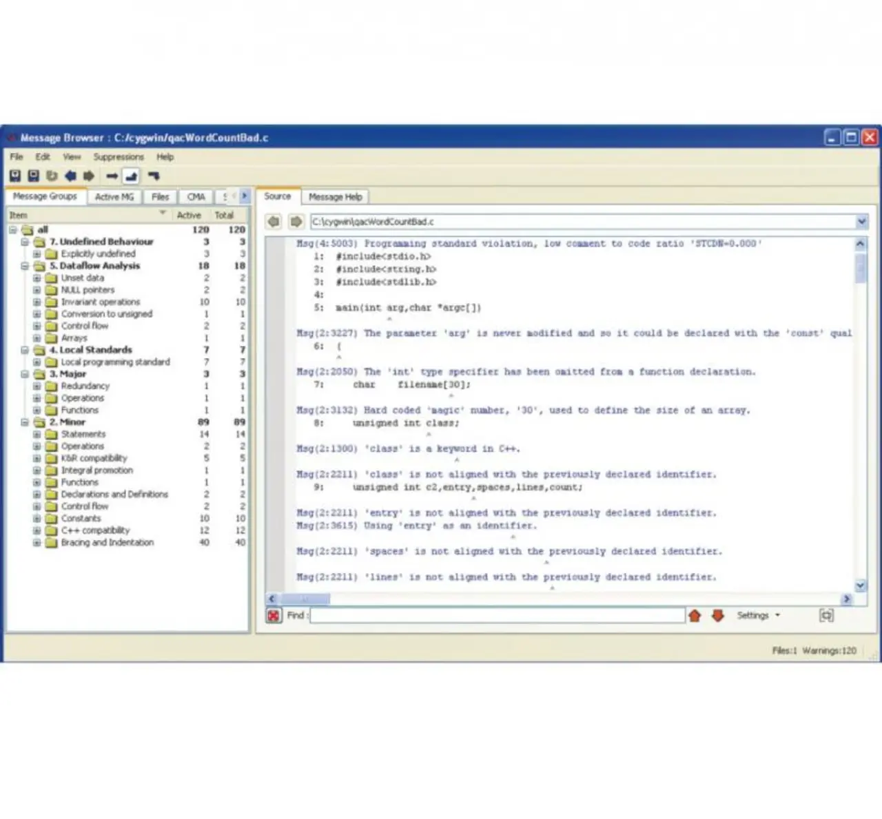 Trotz aller dieser Vorkehrungen benötigte das Werkzeug nur ein paar Sekunden, um 120 Probleme zu erkennen. Diese wurden als Anmerkungen im Quellcode ausgegeben. Aufbauend auf dieser Analyse würde eine normale formale Code-Analyse - insbesondere wegen der Art der gefundenen Probleme - schnell wertvolle technische Ressourcen beanspruchen. So erkannte das Werkzeug zum Beispiel drei Undefined-Behaviour-Fehler, die jeweils unterschiedliche Ursachen hatten, aber alle nach Angaben des Compilers akzeptabel waren. Zusätzlich wurden 18 Probleme in einer Dataflow-Analyse ermittelt, sowie sieben Verstöße gegen lokale Standards. Auch wenn alle diese Probleme potenziell schwerwiegend sind, kann man nur mit einem genaueren Verständnis des Kontexts und der Absichten des Entwicklers herausfinden, ob irgendeines von ihnen weniger kritisch als ursprünglich angenommen ist. Daneben ermittelte das Werkzeug weitere 89 kleinere Probleme, von denen viele Verstöße gegen »lokale« Kodierungsstandards waren. Angesichts der Tatsache, dass der gewählte Kodierungsstandard für eine Organisation stehen sollte, die Wert auf hochqualitativen Code legt, ist es klar, dass auch diese Verletzungen behandelt werden müssen. Denn ihr Schweregrad ist bis zur Ausführung weiterer Untersuchungen unbekannt.