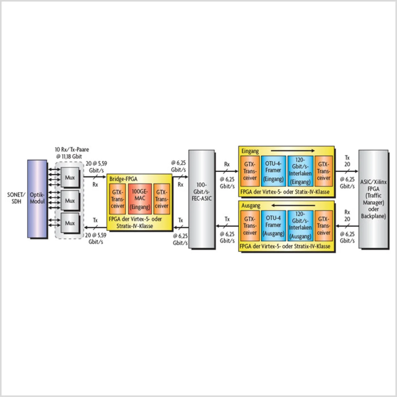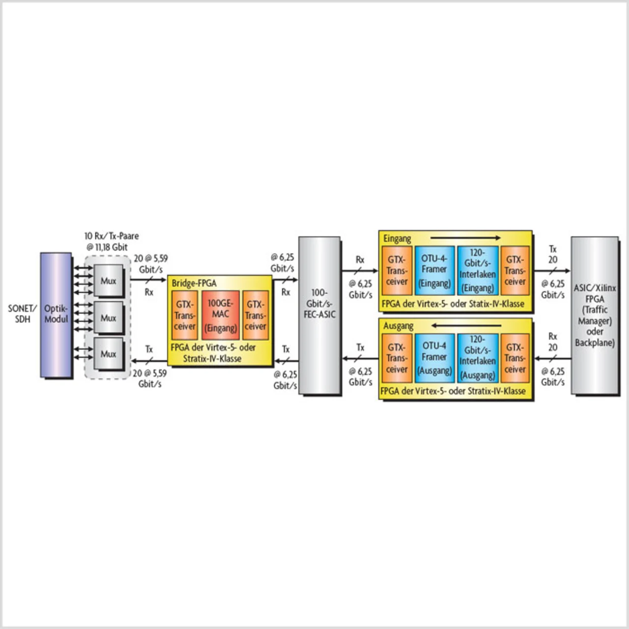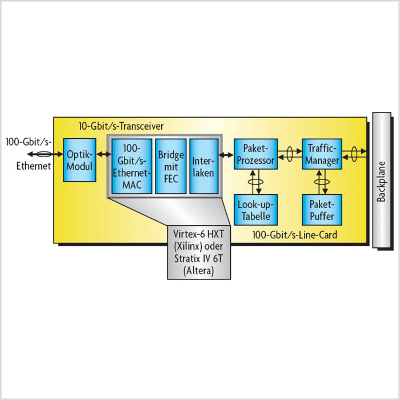 Bild 1 zeigt die Blockschaltung einer 100-Gbit/s-Line-Card. Die Design-Anforderungen umfassen unter anderem bis zu elf 10,3125-Gbit/s-Transceiver (CAUI/ XLAUI zum optischen Modul) und bis zu 24 6,25-Gbit/s-Transceiver (Interlaken zu Backplane), des weiteren müssen DDR3, QDRII oder RLDRAM II mit 533 MHz getaktet werden können. Mit Stratix IV GT oder Virtex-6 HTX lassen sich, wie in Bild 1 gezeigt, Ethernet-MAC, FEC (Foreward Error Correction) und Interlaken in einem einzigen FPGA unterbringen. Bild 2 zeigt das Blockschaltung eines Optik-Routers für Netzwerke, wie er in zahlreichen Rechenzentren im Einsatz ist. Ein Problem besteht u.a. darin, dass bei einer Veränderung des EFEC-Algorithmus (Enhanced Foreward Error Correction) das zugehörige ASIC neu designt werden muss. Des weiteren besteht die grundsätzliche Anforderung, die Kosten durch Verringerung der Komponenten zu reduzieren und die Bandbreite bei gleichbleibender Leistungsaufnahme zu erhöhen.