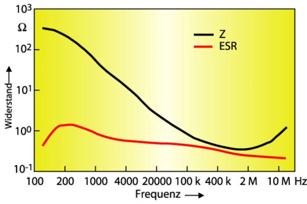 Die elektrischen Parameter eines mit Sicherung versehenen Kondensatormoduls sind recht einfach. Die ESR-Werte von Kondensator und Sicherung sind bekannt und müssen, da es sich um eine Serienschaltung handelt, schlicht addiert werden. Die folgenden Diagramme geben die Frequenzabhängigkeit von Impedanz und ESR für zwei Kondensatoren mit eingebauter Sicherung wieder. Bild 4 zeigt den Frequenzgang für eine Konfiguration mit einer Sicherung bei einem D-Case-Baustein mit 6,8 µF/35 V, Bild 5 den Frequenzgang für eine Konfiguration mit einer Sicherung und ein D-Case-Produkt mit 4,7 µF/50 V. Die ESR-Kurve bricht bei etwas über 400 kHz ab, während die Impedanz oberhalb dieser Frequenz steil zunimmt. Die Ursache hierfür ist der bei höheren Frequenzen zu Tage tretende induktive Blindwiderstand.